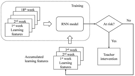 Figure 1 shows the flow of this research. First, we collected student learning behavior data on an online course week by week. At the end of the semester, we eliminated students’ data that showed no learning activities in the semester. The remaining data were used to train the RNN model, which was then used to predict the probability of failure in the class each week. Positive predictions indicate that the teacher needs to intervene in the students’ learning conditions.