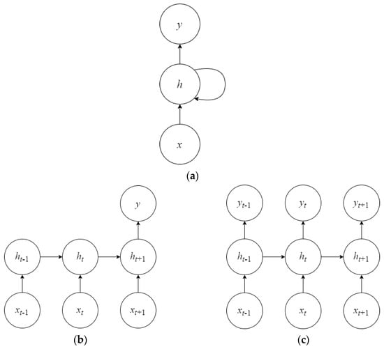(a) A general RNN structure. (b) Many-to-one RNN structure. (c) Many-to-many RNN structure.