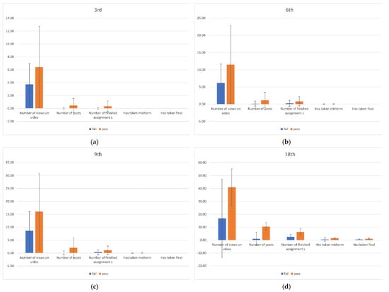 The data for this study were obtained from a general education course at a university in northern Taiwan. This course is a science course called “Introduction to Artificial Intelligence” and the learners are from all departments in that university. This course is fully online, meaning that all class assignments and exams are taken online. The students can view system announcements, homework and exams, while the teachers of this course can correct homework, set exams, issue announcements and check the learning status of students from their learning logs. The characteristic of this course is that learning progress is completely determined by the students. They can apply for and take the online exam at any time after satisfying certain class requirements. If students do not take exams until the 17th week, they are required to take the test in the last week. The learning data of 234 students from three classes were collected for the experiments. The dataset consisted of 126 males and 108 females. Among those, 34% of male students failed this class compared to 17% of females. Overall, fifty-five students (23%) failed this course, indicating that the distribution of the data is somewhat unbalanced. Figure 3 shows the mean and standard deviation for all students in each dimension at the 3rd, 6th, 9th and 18th week. In general, students who passed this course have higher values than those who failed in all dimensions. However, from Figure 3a, we can see that the value of every feature at the 3rd week is quite small and the standard deviation is very large at the first half of the semester in Figure 3a–c, showing that making predictions at the early stage of the semester from this dataset is challenging.