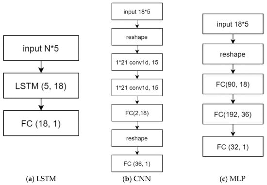 The numbers of hidden units in the SRN, LSTM and GRU models were all set to 18. All models were trained by 150 epochs and the optimizer was Adam [32]. The proposed method was implemented using Python and the Keras framework [33]. Figure 4 depicts the network structure of the LSTM, CNN and MLP used in this study. Table 2 shows the number of parameters of these networks. It is noticeable that the network structure of MLP and CNN were designed to have a number of parameters close to that of the RNN models.