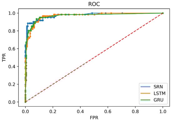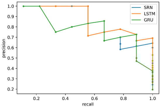 Figure 5 depicts the receiver operating characteristic (ROC) curve of the three RNN models. We can see that the areas under the curve (AUCs) are quite close to each other. However, because the educational data are imbalanced, the ROC curve is affected by the negative samples (i.e., students who passed this course), which form the majority of the dataset. Hence, we conducted another experiment based on the average precision, the results of which are shown in Figure 6. The average precision of SRN, LSTM and GRU were 0.65, 0.77 and 0.68, respectively. From Figure 6, we observe that the LSTM model performed slightly better than the other two RNN models in terms of average precision, showing that the LSTM model performed best among three models in capturing the learning patterns of students who might fail this course.