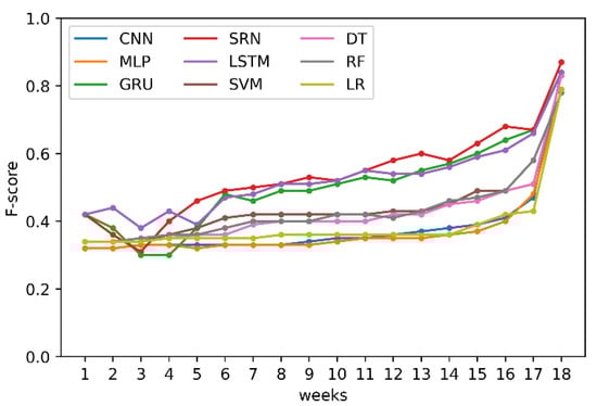Given that many studies have applied machine learning models to their problems, this study compares the performance of RNN models with that of conventional machine learning models, including LR [30], SVM [30], DT [30], RF [30], MLP [30] and CNN. As these methods are not suitable for analyzing sequential data, in this study, we followed the design protocols of Du et al. [30] and Lee et al. [30]. More specifically, unlike the RNN model, which uses full data to train the model, we trained the model and evaluated its performance using the data for a specific number of weeks (e.g., three weeks). Table 14 presents the F-scores of all models at different weeks. The highest scores at each specific week are marked in bold. We can see that the F-scores of LR, SVM, DT and RF are below 0.5 when the number of weeks is fewer than 18. The neural network models, MLP and CNN, had slightly better performance than conventional machine learning models, but the F-scores are not over 0.51. The MLP model has the best F-score of 0.95 of all models when considering the complete 18 weeks of data. However, taking the entire learning dataset into account is not a good practice in terms of developing an EWS during the learning process of the course. The F-scores for all models are presented week by week in this study (see Figure 7). From Figure 7, we can observe that the RNN-based models surpassed other models after the 6th week. Our results suggest that RNN-based models can be used to identify at-risk students after one-third of the semester. This finding also echoes the conclusions made in [30].