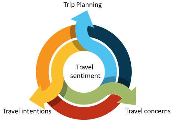 This concept of travel sentiment integrates three dimensions that are already considered in the literature but not always assessed together: travel intentions, trip planning, and travel concerns [32,33,34] (see Figure 2). Moreover, although firms acknowledge the concept of travel sentiment, it has not been tested with other variables known to affect tourist behavior, which is a gap that the present study aims to address.