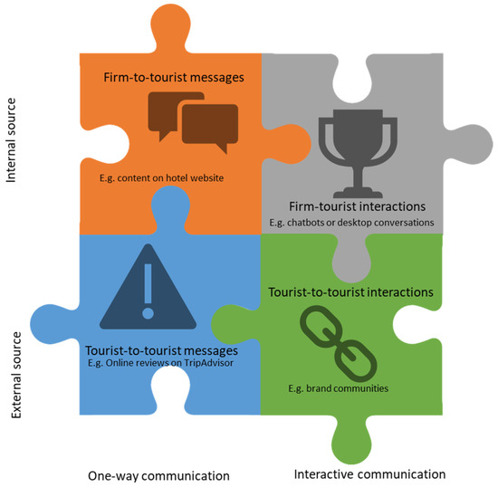 The most substantial changes occurred after Web 2.0, when users were empowered with a set of content-creation tools that shifted the communication paradigm [58,59]. During the last two decades, they have become active online searchers and creators of all kinds of information. As noted by Fotis et al. [60], the use of social media reflects and influences tourists’ perceptions, attitudes, behaviors, and shopping requirements. Moreover, social media provides an ecosystem in which information flows faster and is amplified so that organizations can be noticed via small investments and in short time periods. As social media grows, communication strategies are increasingly tailored to target digital users on different platforms [61]. Thus, developing effective and engaging communication on social media is an ongoing challenge for tourism and hospitality firms [59,62], one that relies on identifying tourist behavior, co-creating experiences, and transforming big data into actual knowledge [63].