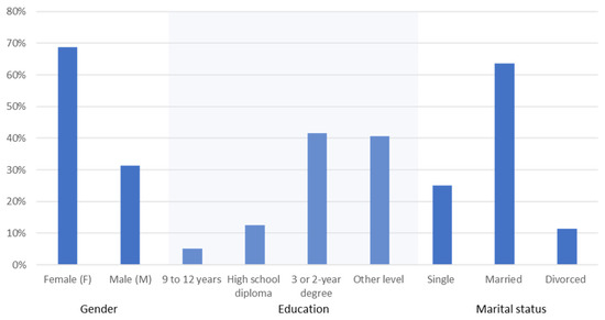Figure 6 summarizes the frequency distributions of our collected data in terms of basic socio-demographics, including gender, marital status, and education.