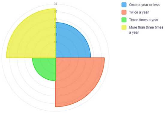 The average age of the participants was 44 years; the youngest and oldest participants were 22 and 73 years old, respectively. Of all participants, 23.96% acknowledged traveling once a year before COVID-19, while 33.33% traveled more than twice a year (see Figure 7). In addition, 51.04% of the participants made these trips with their spouse or partner.