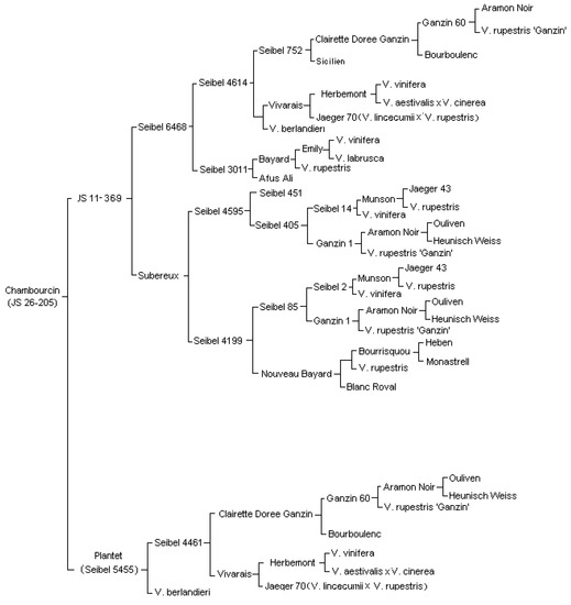 Parentage diagram for Chambourcin cultivar. This diagram was realized starting from the parentage diagram available for Seibel 6468, Subereux, and Plantet at the link http://chateaustripmine.info/Parentage.htm (accessed on 29 September 2021). For more details see Section 2.1.