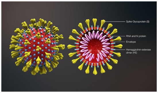 - Scientific Animations Inc. 3D Medical Animation Corona Virus. Available online: https://commons.wikimedia.org/wiki/File:3D_medical_animation_corona_virus.jpg (accessed on 16 July 2021).