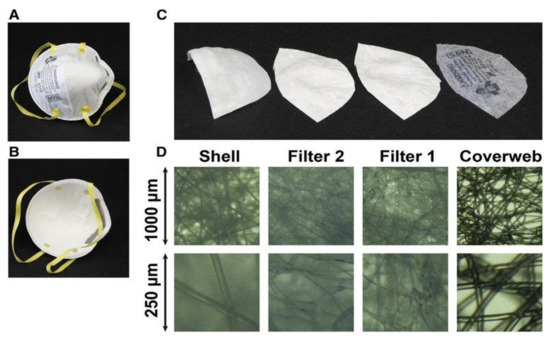 Multilayer sandwich anatomy of N95 mask. (A) Environmental interface; (B) user interface; (C) from left to right: inner layer (shell), middle layers (filter 2 and filter 1), and outer layer (coverweb); (D) light microscope images of the four layers, with a lower row at four-fold higher magnification (3M model 8210). Adapted from [18] with permission.