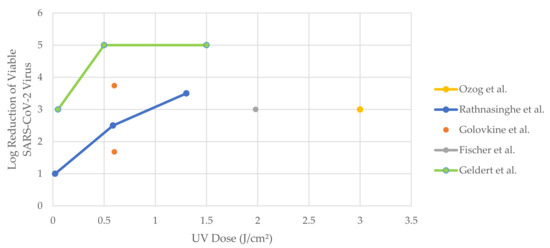 In a study, Ozog et al. [20] had demonstrated successful decontamination when an N95 mask was irradiated with 1.5 J/cm2 of UVC (254nm). It was concluded that the dose applied was sufficient. However, a concern on the disinfection of the strap arises due to its coverage by UVC on the strap surface. Rathnasinghe et al. [43] presented a simple UVC decontamination device without the mask’s strap decontamination. Golovkine et al. [44], Smith et al. [45], Fischer et al. [46], and Geldert et al. [47] investigated and compared the efficiency of UVC-based decontamination systems for N95 respirators with other decontamination methods such as ethanol, heat, UVA, ethylene oxide, hydrogen peroxide plasma and vapor, MGS, bleach, and liquid hydrogen peroxide. Comparing across the studies, a UVC-based N95 disinfection treatment with a dosage of greater than 0.5 J/cm2 can achieve the minimum pathogen load reduction required of three-log reduction against the SARS-CoV-2 virus. As Figure 3 illustrates, Geldert et al. [47] demonstrated notable disinfection of five-log reduction at a relatively low dosage of 0.5 J/cm2. Nevertheless, the reported sharp decline in the log reduction of SARS-CoV-2 [47] at lower UVC doses (0–0.5 J/cm2) must be addressed with caution.