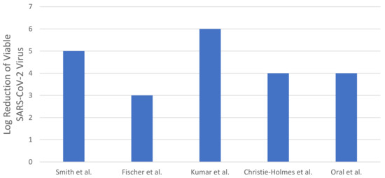 Smith et al. [45], Fischer et al. [46], Kumar et al. [58], Christie-Holmes et al. [59], and Oral et al. [60] have investigated the efficiency of HPV-based decontamination systems for N95 respirators against the SARS-CoV-2 virus. All the studies that reported HPV-based decontamination against the SARS-CoV-2 virus were designed using commercially available HPV generating machines. The comparison of the HPV-based N95 decontamination system efficiency across the studies is presented in Figure 4. The concentration of hydrogen peroxide exposed and the treatment time of a complete cycle comprised of four different processes are the variables that play a significant part in HPV-based decontamination systems to deliver the required decontamination efficiency. Notably, Kumar et al. [58] demonstrated a significant reduction in SARS-CoV-2 of six-log reduction while preserving the functional integrity of the N95 respirator post-treatment.