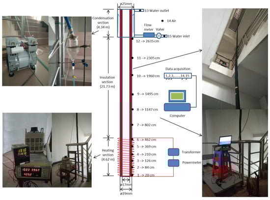 To study the operation characteristics of the super-long heat pipe, 15 temperature measurement points are used along the heat pipe to monitor temperature changes. Among these, points (thermocouples) 1–6 measure the temperature of the evaporation section, points 7–12 measure the adiabatic section temperature, point 13 the cooling-water inlet temperature, point 14 the air temperature, point 15 the cooling-water outlet temperature. Computer and data acquisition equipment collects the temperature data with a sampling rate of 1 Hz. To make the condensation section full with cooling-water, the cooling-water inlet is at the bottom of the section and the outlet at the top (see Figure 1). The temperatures are measured with K-type thermocouples with an error of ±0.3 °C. The cooling-water flowrate in the condenser is measured using a rotameter with an error of ±0.1 mL/s. The heating power is measured with a digital power-meter (0–12 kW) with an uncertainty of ±1% FS (Full Scale).