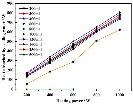 Figure 2 shows the heat pipe’s heat-transfer performance for different working-fluid filling volumes. The cooling-water flow rate is fixed at 5.5 mL/s. When the filling volume is about 400 mL, the heat pipe’s heat-transfer performance is always the best among the different measured heating-powers. In addition, Figure 2 shows that the higher the heating power is, the bigger is the heat-transfer rate of the heat pipe. In addition, when the working-fluid filling volume is 2500 mL, the heat pipe’s heat-transfer rate decreases remarkably. Furthermore, when the working-fluid filling volume is 5000 mL, the heat pipe does not work at all.
