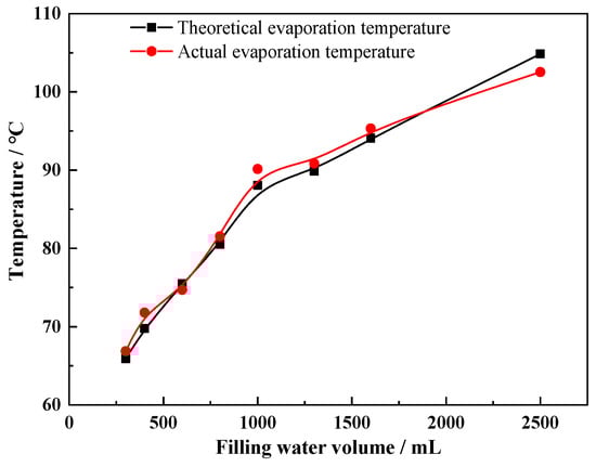 Comparison between the theoretical evaporation temperature and actual evaporation temperature (heating power: 600 W, coolant water circulating flow rate: 5.5 mL/s).