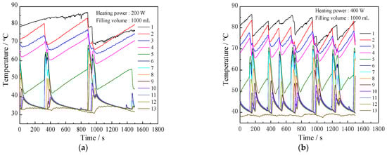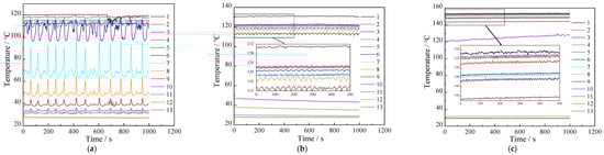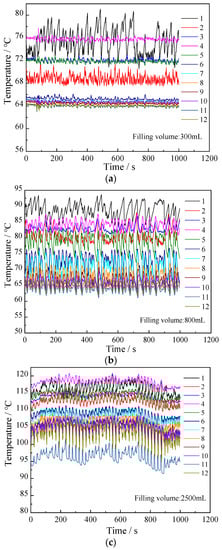 Temperature vs. time curve for each measurement point for different liquid filling volumes (Liquid filling volume: (a) 300 mL, (b) 800 mL, (c) 2500 mL; Heating power: 1000 W; Cooling-water flow rate: 5.5 mL/s; 1–12 are measuring points indicated in Figure 1).