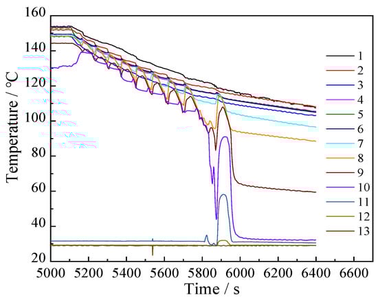 Temperature evolution for the heat pipe when the heating power was stopped after 600 W heating (filling volume: 5000 mL; cooling-water flow rate: 5.5 mL/s; 1–13 are measuring points indicated in Figure 1).