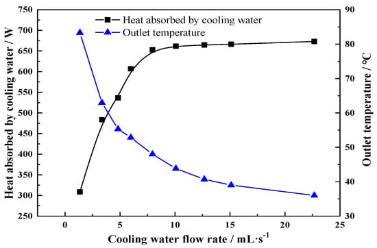 Previous sections show that a suitable filling volume is about 400 mL. Figure 7 shows the heat-transfer performance for the heat pipe at different cooling-water flow rates with a filling volume of 400 mL and heating power of 800 W. The figure also shows that, with increasing cooling-water flow rate, the heat-transfer rate increases and reaches a plateau gradually, and the cooling-water outlet temperature decreases.