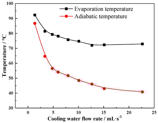 Temperature in the evaporation and the adiabatic section as a function of the cooling-water flow rate (filling volume: 400 mL, heating power: 800 W).