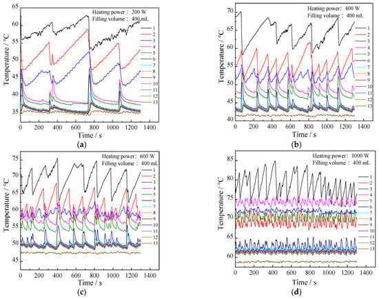 Temperature variations of the heat pipe for the different heating powers (a) 200 W; (b) 400 W; (c) 600 W; (d) 1000 W. (filling volume: 400 mL, cooling-water flow rate: 6.0 mL/s; 1–13 are measuring points indicated in Figure 1).