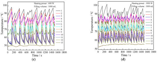 Temperature variations of the heat pipe for different heating powers (a) 200 W; (b) 400 W; (c) 600 W; (d) 1000 W. (filling volume: 1000 mL, cooling-water flow rate: 6.0 mL/s; 1–13 are measuring points indicated in Figure 1).