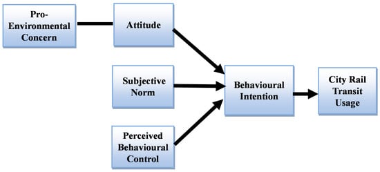 TPB is the underlying theory of this research which is used to predict actual customer behavior through intentions []. Several studies successfully applied the TPB to measure the behaviors and preferences for voting, smoking, driving, usage, traffic violations, technology use, and many more. Previous studies adopted other theories to indicate the behavioral choice of individuals towards a particular action. Therefore, the most used approach to predict human behavior is the theory of planned behavior TPB []. Previous studies have adopted a planned behavior approach to predict the public’s behaviors towards transportation usage. Therefore, the most suitable theory for the current research is the TPB.