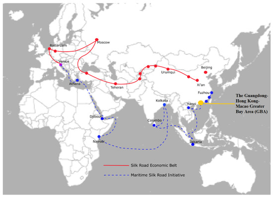 The GBA and the BRI. Source: adapted from Wang L. et al. (2019) [7].