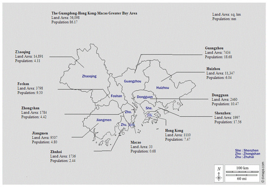 Basic information of the GBA. Data Source: Bureau of Statistics of Guangdong, Hong Kong, and Macao; The figure is adapted based on the map at https://d-maps.com/carte.php?num_car=20983&lang=zh, accessed on 1 October 2021.