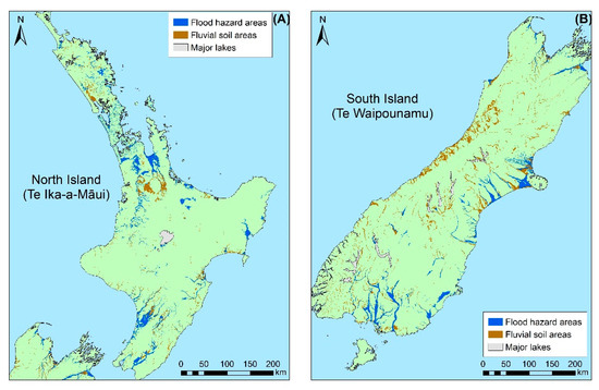 Mapped (ArcGIS Pro) flood hazard areas and FSL fluvial soil areas for (A) the North Island and (B) the South Island of A-NZ (for FHZ map sources, see Supplementary Material S1; fluvial soil areas were sourced from LRIS Portal [35]).