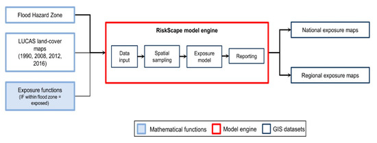 Workflow of the RiskScape model applied in this study to quantify agricultural land exposure in FHZs (based on [55]).
