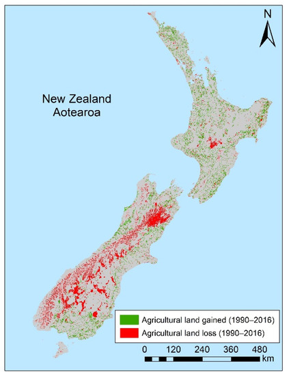 Agricultural land-use change in A-NZ 1990–2016 defined by the LUCAS dataset, showing areas that were not used for agriculture in 1990 but were in 2016 (agricultural land gained) and areas that were agricultural in 1990 but were no longer by 2016 (agricultural land lost) (areas sourced from [35]).
