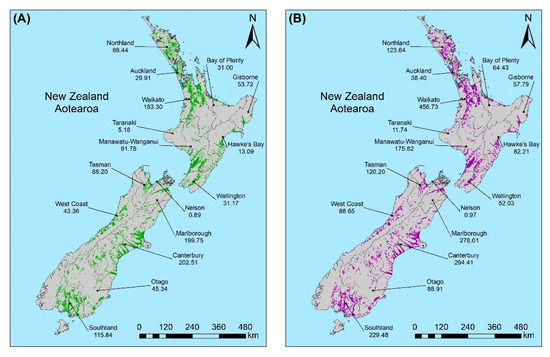 Overall, Hawke’s Bay was the only region to show an increase (23,000 ha) in FHZ agricultural land within this time (Supplementary Material S3), which was primarily driven by horticultural expansion. This increase was likely an overestimation due to improvements in the identification of land-use types driven by remote sensing technology development; however, a significant increase in horticulture in the area has been reported elsewhere [59].