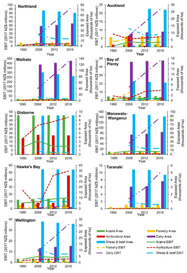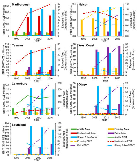 The potential annual EBIT for FHZ dairy farming increased by nearly NZD 890 million from 2008 and 2016. Conversely, the potential EBIT from sheep and beef farming, arable land, and forestry in FHZs decreased over this time (decreases of NZD 107 million, 10 million, and 4 million, respectively; Table 3). A sharp rise in the amount and value of dairy farming, along with a more gradual increase in horticultural land area and production value, drove an increase of NZD 1.9 billion in the total potential EBIT from agricultural land within FHZs between 1990 and 2016, thus substantially increasing the overall economic exposure of agricultural industries (Table 3).