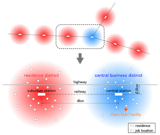 The entities represent a highly abstracted planar urban schematic and the household agents. Both are expressed spatially and explicitly. The planar size of the model space corresponds to 20 km in the real world. Figure 1 shows the urban schematic. This is the abstraction of a part of a typical regional city that has a central business district (CBD) and suburban towns connected by a railway. The city was planned according to the zoning, with a separation between residences and job locations. Therefore, despite the polycentric and rational land use, a clear hierarchy exists between the districts. In modern Japan, many towns with this schematic were developed in the suburbs of large cities, along the railway routes centering on such cities. This was partly due to the lack of suitable land for urbanization due to the mountainous landscape [43,44].