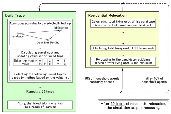 Figure 2 shows the scheduling of household agents. Each household agent commutes daily based on the value list of linked trips, and after the learning period of repeating this daily travel 30 times, fixes travel modes in one way. After, a portion of the household agents relocate their residences to the candidate residences based on the total living cost. The change in land-use pattern is produced through these residential relocations. In this study, after the loop process of residential relocation was repeated 20 times, the simulation stopped processing. This model assumes that 30 repetitions of daily travel (a single loop process of residential relocation) represent 2 years in the real world. Therefore, 20 loop processes of the residential relocation correspond to a simulation of 40 years in the real world, and, in the 40 years, a household agent relocates twice on average. Households actually tend to relocate with changes in a family structure, such as birth, separation, etc. [48,49] Based on the above, this scheduling can be considered valid.