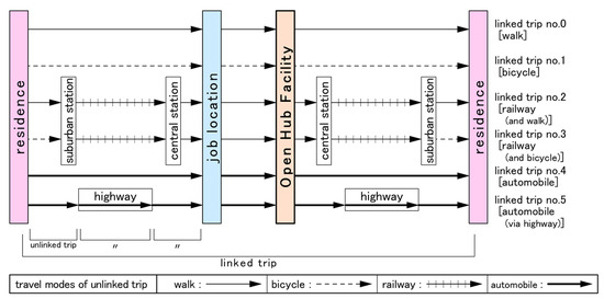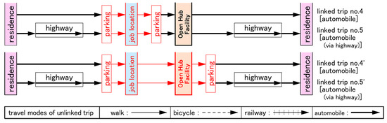 Each household agent repeats daily travel according to the selected linked trip. In this study, six types of linked trips were assumed, as shown in Figure 3. The representative travel mode is one of the following: on foot, by bicycle, by railway, or by private automobile. The initial representative travel mode of all household agents is railway (linked trip no. 2 or 3), according to the original planning philosophy.
