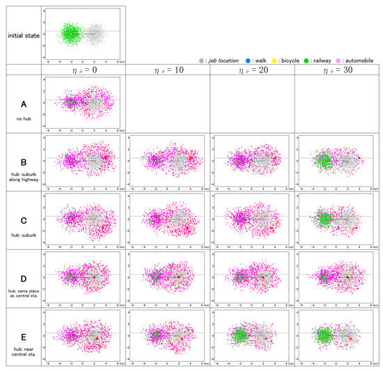 To focus on the change in land-use patterns through the residential relocation of household agents, we adopted the classical exogenous job location assumption. In other words, the position of a job location corresponding to a certain household agent is always fixed, and one-worker households are included. A linked trip indicates the series of travel of each household agent from the starting point to the destination. An unlinked trip indicates each travel mode that is a component of a linked trip.