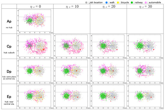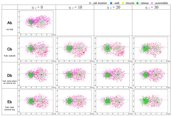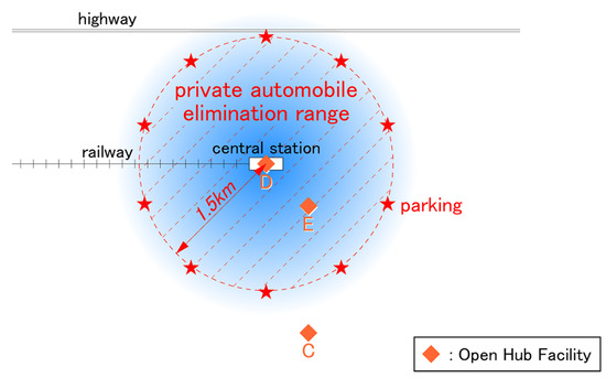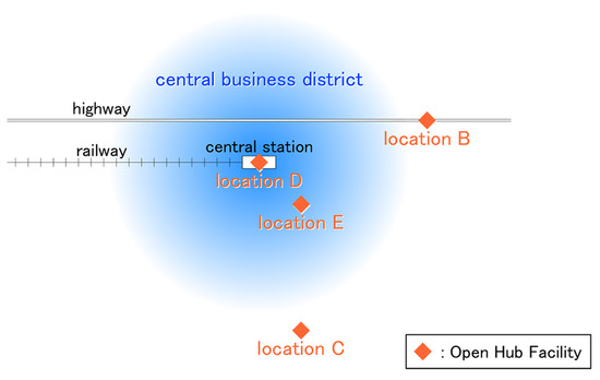 Additionally, one hub facility that is open to people, and plays a role in attracting diverse activities to city center, is located in the CBD. This is assumed to provide complex facilities such as the library-centered complexes that have been introduced in recent years, e.g., Idea Stores in London, U.K. [46]; and the new Seattle public library in Washington, USA [47]. However, the operator may be public, private, or a combination of the two. The hub is also equipped with car and bicycle parking. Within a 500 m radius centering on the hub, which was set as an influential area, the interaction promotion policy was considered (see below).