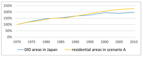 With such a simple urban form and well-developed public transportation, the potential for and threat of urban diffusion may seem rather modest. However, in reality, the urban area in Japan has consistently been expanding [6,44], while the share of railways in passenger transport has declined from nearly 80% in 1960 to less than 30% today (the share of private automobiles has increased from less than 5% to over 60%). As a result, the business conditions of railway operations, especially in rural areas, have deteriorated; in the last 20 years, more than 1100 kilometers of railway lines have been discontinued on 45 routes [45]. This situation shows that cites, although clearly planned, as assumed above, can easily diffuse.
