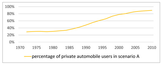 where , , and indicate bicycle parking fare, automobile parking fare, and railway fare, respectively; indicates gas price; and total gas price is proportional to travel time by private automobile . These were determined as reasonable values for the model conditions based on statistical data [57].