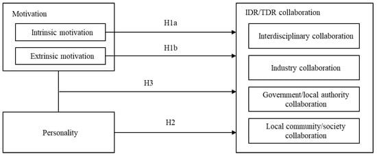 Intrinsic motivation has a consistently positive effect on IDR/TDR collaboration, as indicated by Hypothesis 1a. Consistent with previous analyses showing that intrinsic motivation has a positive effect on normal research activities, the results indicate that it has a broader effect [70,102]. Although the goal of IDR/TDR is to solve a social problem, the results of this study suggest that it is necessary to link intrinsic motivation with the researcher’s interest and curiosity to achieve this goal. Conversely, as shown in the verification based on Hypothesis 1b, a strong relationship is found between extrinsic motivation and industry collaboration or government/local authority collaboration especially. These collaborations are an important process in the social implementation of science, but when the process is unlikely to generate interest and curiosity in the researcher, extrinsic motivations such as rewards and recognition may facilitate it. Extrinsic motivation is likely to facilitate performance in a behavioral task in situations where financial rewards are expected in advance through intellectual property or ventures [103].