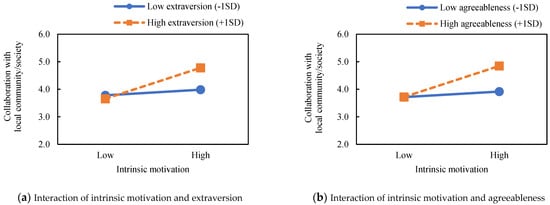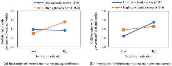 For Hypothesis 3, the interaction between motivation and personality, there are significant differences in six items at the 5% or 1% levels (Model 1d, 1e, 2d, 2e, 3d, 3e, 4d, 4e). There is no significant interaction effect in the model with interdisciplinary collaboration as an independent variable, but there are significant interaction effects on two items in each of the other three TDR indicators. Figure 2, Figure 3 and Figure 4 display these six significant interactions. Figure 2 shows that when there is low openness to experience, intrinsic and extrinsic motivation have a more sensitive effect on the orientation of industry collaboration. Figure 3 describes interactions in collaboration with government/local authorities. Interestingly, intrinsic motivation has a negative impact on collaboration with these authorities when agreeableness is low. Although intrinsic motivation is generally known to have a positive impact on a broad range of performance indicators, this result suggests that it might have no or a negative impact under some conditions. Finally, Figure 4 shows that extraversion and agreeableness amplify the positive effect of intrinsic motivation on the enhancement of regional/societal collaboration. In summary, there is no interaction effect for interdisciplinary collaboration, but the other three TDR collaboration indicators support Hypothesis 3.