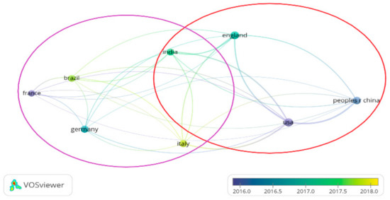 With the help of VOSviewer, which aids researchers in producing, envisioning and discovering maps based on network data, a network map of country coauthorship was created (Figure 4). In Figure 4, clusters are formed by the frequency of occurrence. In contrast, the circle’s dimension indicates the number of publications, with the thickness of the line representing collaboration size. It has been revealed that two clusters formed of eight countries contribute to the most extensive set of connections by collaborating in more than five publications. In addition, China showed the most substantial collaboration with other countries, including the United States and the United Kingdom, followed by the United Kingdom, the United States and India. Moreover, Figure 4 reveals that the most recent collaborations were done in Italy, Brazil and India. Using VOSviewer, a network visualisation of keyword co-occurrence was created (Figure 5). Based on the criteria that a keyword should appear in a minimum of five papers to be analysed, it was revealed that 100 out of 108 papers fit into the criteria. Therefore, the analysis generated nine clusters with 800 links and a total link strength of 323.