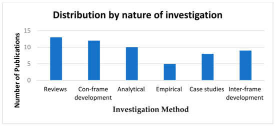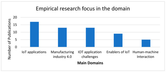 The selected studies were based on several domains related to IoT and its applications in the manufacturing Industry 4.0. These domains were informed by our research objectives, inclusion and exclusion criteria and quality attributes. Many publications were found in IoT applications, followed by Industry 4.0 and IoT challenges, IoT drivers and interaction between humans and machines (Figure 6). Our finalised papers presented us with two unique features. First, Figure 6 represents the most critical domains in the extant empirical research, focused on by the developed or technically developed countries in their investigations. Second, the most prominent methods of study were reviews and conceptual framework developments. This could be attributed to the newness of the discipline and the conceptual understanding of multiple issues in the domain [62]. Figure 7 shows investigation methods applied in our finalised papers. Table 2 shows general information about the key papers in our research domain.