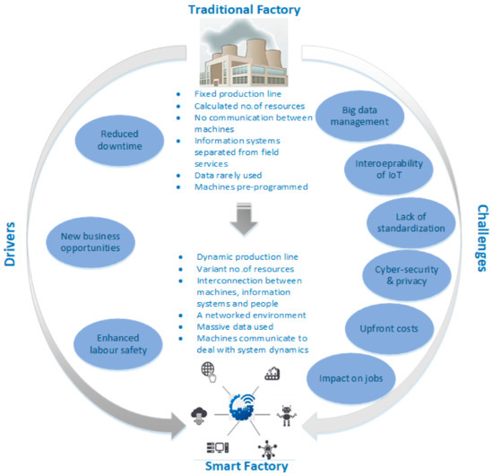 The extant empirical research has divided the smart factories into three components [92]. The web information is used to perform with high efficiency, agility and flexibility and use different levels of understanding to bring transparency to the factory. Firstly, real-time data and information from several components such as sensors are used by machines to achieve self-awareness and self-comparison [93,94]. This self-awareness, also known as predictive maintenance, enables the machines to evaluate their work and analyse any malfunctioning components [78,95]. Consequently, the machine can prevent possible failures and predict risks associated with the final product. Secondly, smart machines can examine their performance and efficiency with other machines by sharing information through cyberspace [72,96,97]. This self-comparison of the machine allows it to adapt its settings and efficiency according to the knowledge collected from information sharing. At this point, the manufacturing system can customise individual machines’ performance based on self-comparison [34,75]. Finally, as a result, the production system can change its configurations to modify the position of all the machines involved in the manufacture of every single product. This guarantees good-quality products with optimum operational costs [42,98]. Figure 9 shows a comparison of the traditional factory and smart factory.