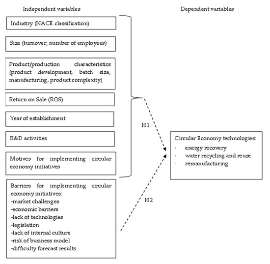 A Hypothesis (H1) was developed in order to investigate this relationship (Figure 1). It is hypothesized that there are significant variations in the implementation of CE technologies in companies from different countries and with different product or manufacturing characteristics (Figure 1). The first argument is related to the existence of business support institutions, “green” attitudes, and other factors which are known to vary from country to country. The second argument reflects the fact that various technological/product configurations in different industries could either limit or promote the implementation of specific CE technology.