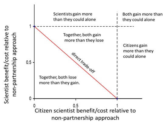 Aggregate benefits of Citizen Science (CS) programs can be visualized as above. Synergy, where citizens and/or researchers gain more than they could on their own is the gold standard for CS programs but not always obtained. Complementarity, where the benefit to both exceeds the direct 1:1 trade-offline, might be more common [34].