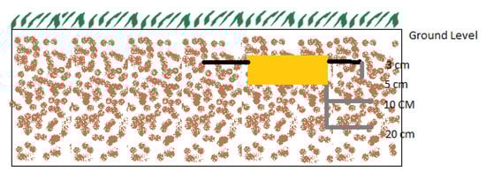 One GI Sensor Box was installed by the digger citizen science group in each bioswale in a location at the corner farthest from the inlet. The id name of the individual sensor and the time the installation began were recorded on the datasheet and then the box was place at the bottom of a hole dug using gloves approximately 30 cm long × 15 cm wide × 20 cm deep. The GI Sensor Box was positioned in the hole with its components arranged as shown in the diagram (Figure 2), with soil placed back into the hole as each sensor component was installed, beginning with the bottom-most component at 20 cm deep and working up to the surface level. The location of the sensor box in the bioswale was then marked on the map with an ‘S’, and we were able to retrieve most of the sensors using this information.