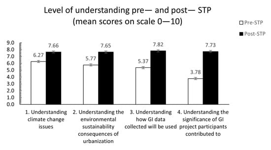 Mean scores (± standard errors) of pre- and post-STP survey responses to questions focusing on the participants’ understanding of focal issues (climate change, urbanization), and the significance of the green infrastructure field research activities that they participated in. (Q1 pair: t = 17.600, df = 322, p < 0.001; Q2 pair: t = 20.373, df = 327, p < 0.001; Q3 pair: t = 20.907, df = 326, p < 0.001; Q4 pair: t = 27.201, df = 325, p < 0.001).