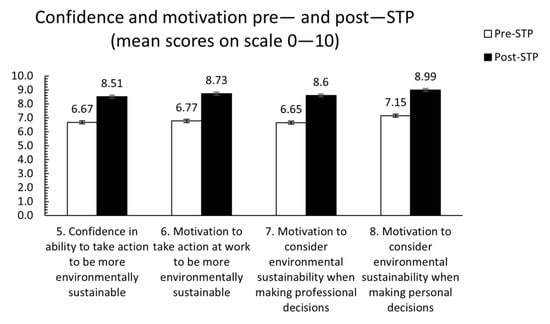 Mean scores (± standard errors) of pre- and post-STP survey responses to questions focusing on the participant’s confidence to take environmentally sustainable actions, motivation to act at work, and to consider environmental sustainability when making professional and personal decisions. (Q5 pair: t = 16.372, df = 327, p < 0.001; Q6 pair: t = 18.858, df = 327, p < 0.001; Q7 pair: t = 18.015, df = 326, p < 0.001; Q8 pair: t = 18.496, df = 326, p < 0.001).