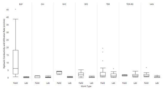 Field and laboratory infiltration rates and hydraulic conductivity values across the cities studied displayed as a box and whisker plot showing the median, 25% and 75% quartiles the full range of the data and extreme values.